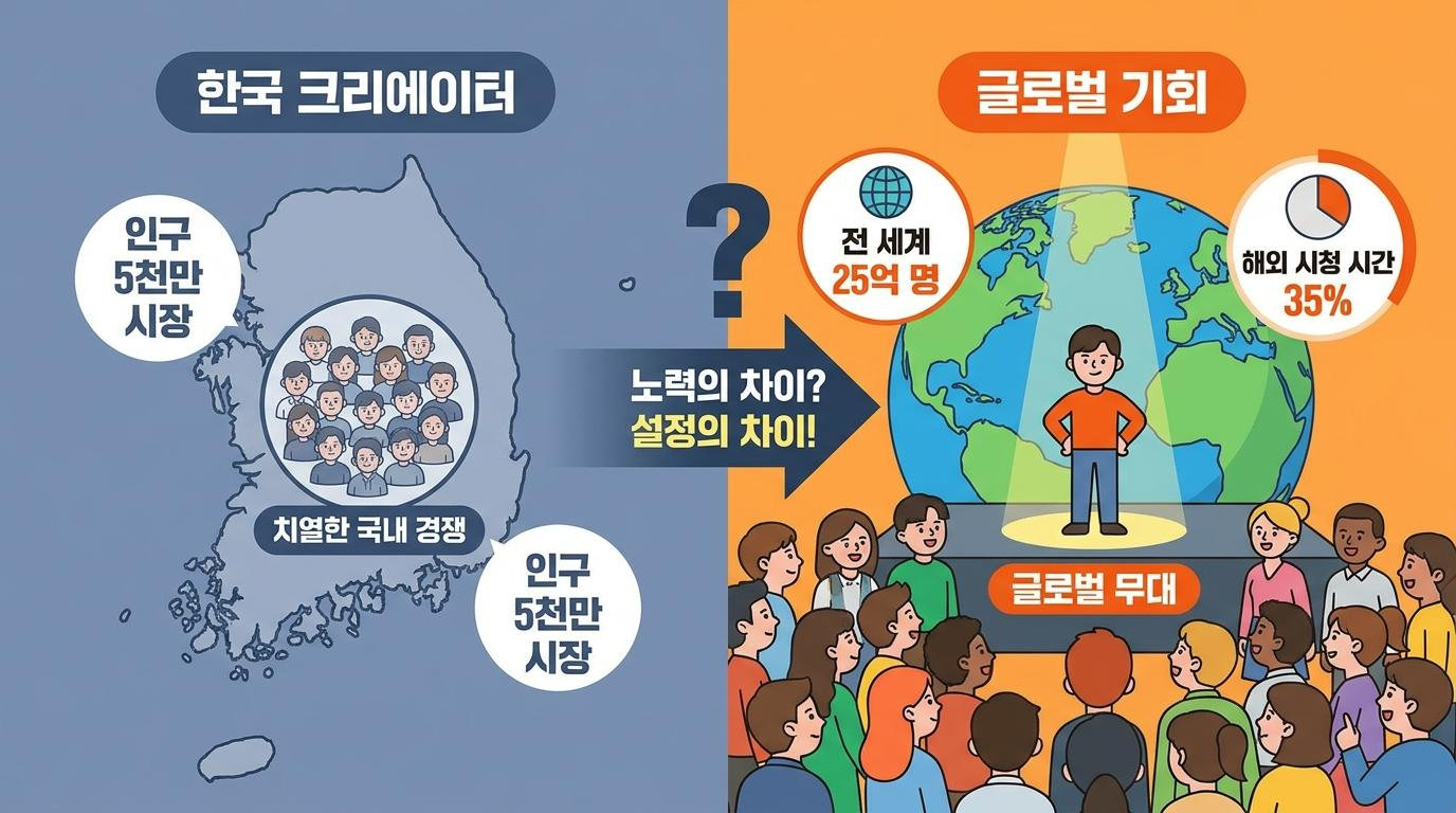 유튜브는 전 세계 25억 명 이상이 사용하는 플랫폼입니다. 그런데 한국의 수많은 크리에이터들은 지금 이 거대한 무대의 한 귀퉁이, 즉 인구 5천만 명의 시장 안에서만 치열하게 경쟁하고 있습니다. 콘텐츠의 품질이나 편집 완성도가 비슷한 두 채널이 전혀 다른 조회수를 기록하는 이유가 바로 여기에 있습니다. 노력의 차이가 아니라, 설정의 차이입니다.