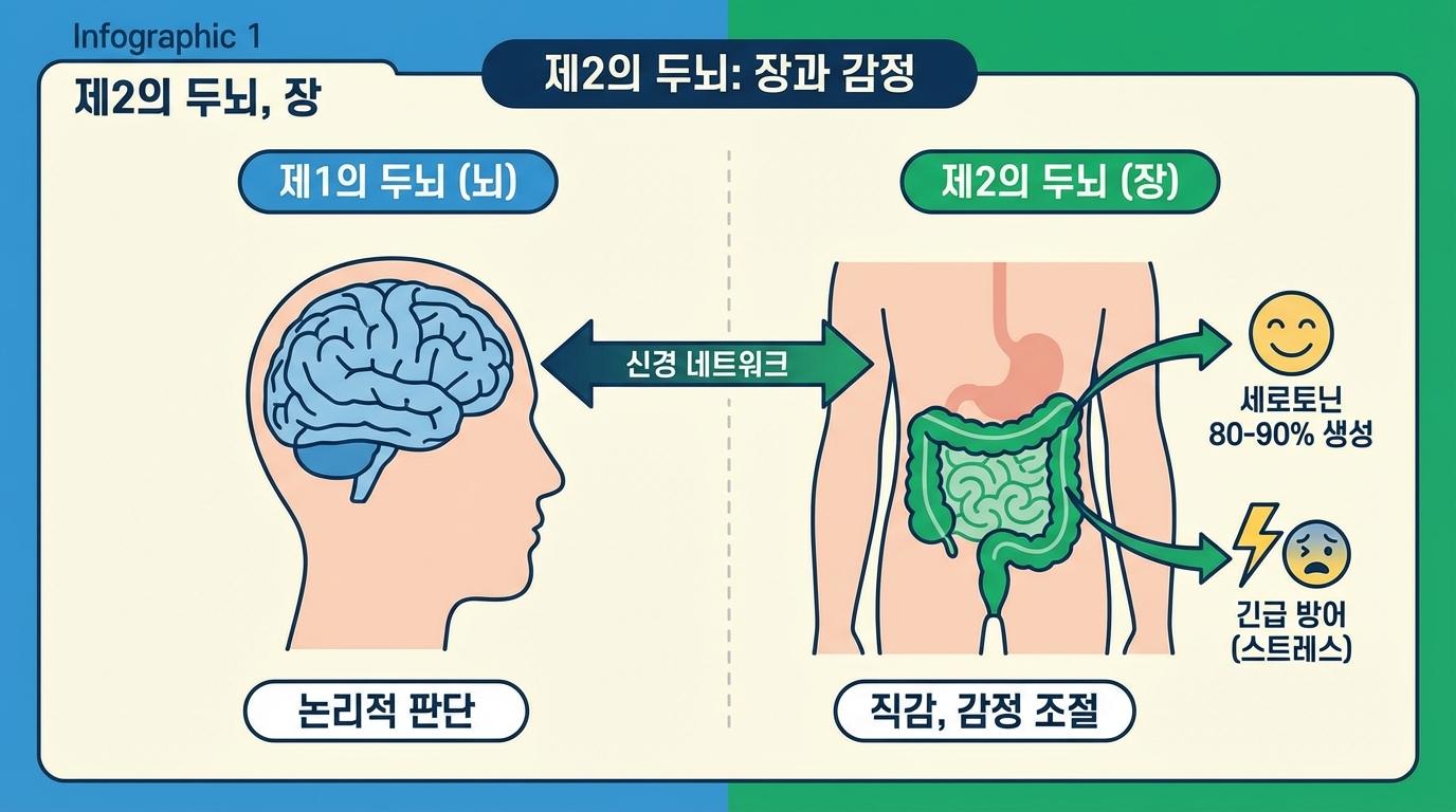 우리는 중요한 결정을 앞두고 "직감을 믿어라"라는 말을 종종 듣습니다. 영어로는 이를 "Gut feeling(창자의 느낌)"이라고 표현합니다. 단순히 관용적인 표현 같지만, 여기에는 놀라운 의학적 진실이 숨어 있습니다. 우리의 장 주변에는 척수나 말초신경계와는 독립적으로 작동하는 거대한 신경세포 네트워크가 존재합니다. 신경세포의 수만 해도 두뇌 세포만큼이나 많기 때문에 과학자들은 이를 '제2의 두뇌'라고 부르기도 합니다.