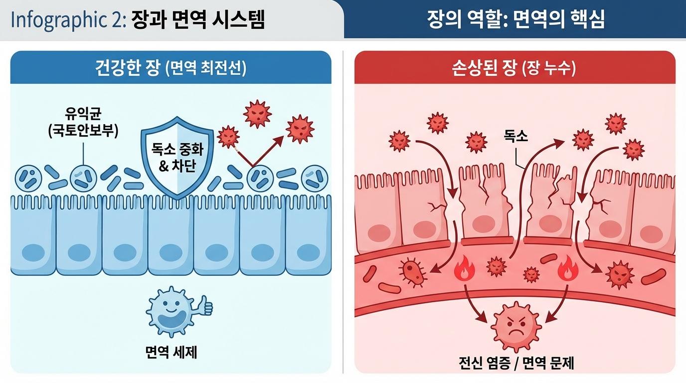 이 구멍을 통해 소화되지 않은 음식물 찌꺼기, 독소, 나쁜 세균들이 혈액 속으로 쏟아져 들어옵니다. 우리 몸의 면역계는 이것들을 적으로 간주하고 총공격을 퍼붓습니다. 이 과정에서 전신에 염증 반응이 일어나고, 면역계가 과민해져 아군과 적군을 구별하지 못하는 자가면역 질환, 알레르기, 피부 트러블, 만성 피로 등이 발생하게 됩니다. 결국 장에서 시작된 불씨가 온몸으로 번져나가는 것입니다.