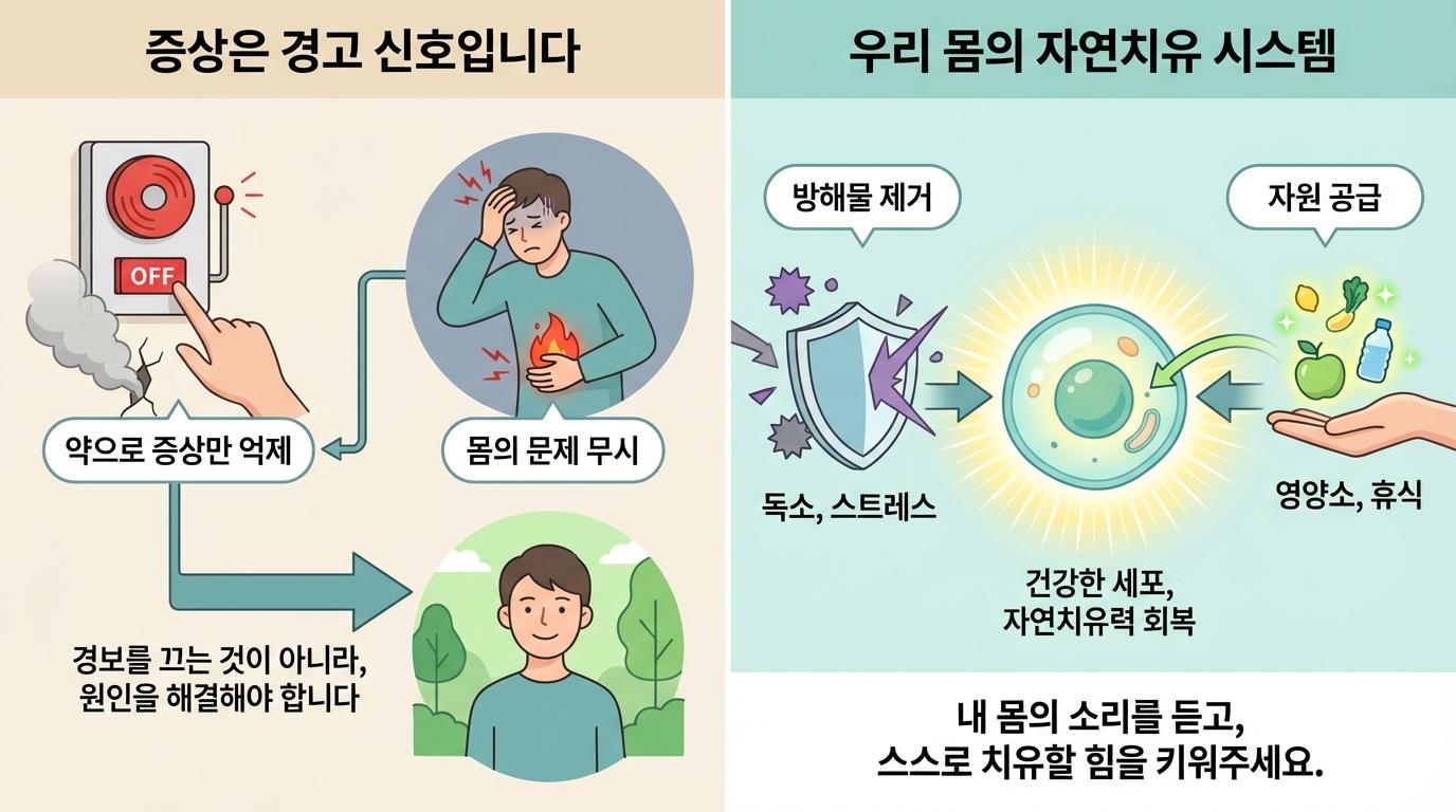 경보기를 끈다고 해서 불이 사라지는 것은 아닙니다. 마찬가지로, 몸이 보내는 비명을 약물로 잠시 억누르기만 한다면, 우리 몸은 스스로를 회복할 기회를 잃어버리고 결국 더 큰 불균형 상태로 치닫게 됩니다. 증상은 우리 몸 어딘가에 문제가 발생했음을 알리는 중요한 신호등 역할을 합니다. 이 신호에 귀 기울이고 그 의미를 파악하려 노력할 때, 우리는 비로소 문제의 근원을 찾아 해결하고 몸이 스스로 치유할 수 있는 환경을 조성할 수 있습니다.