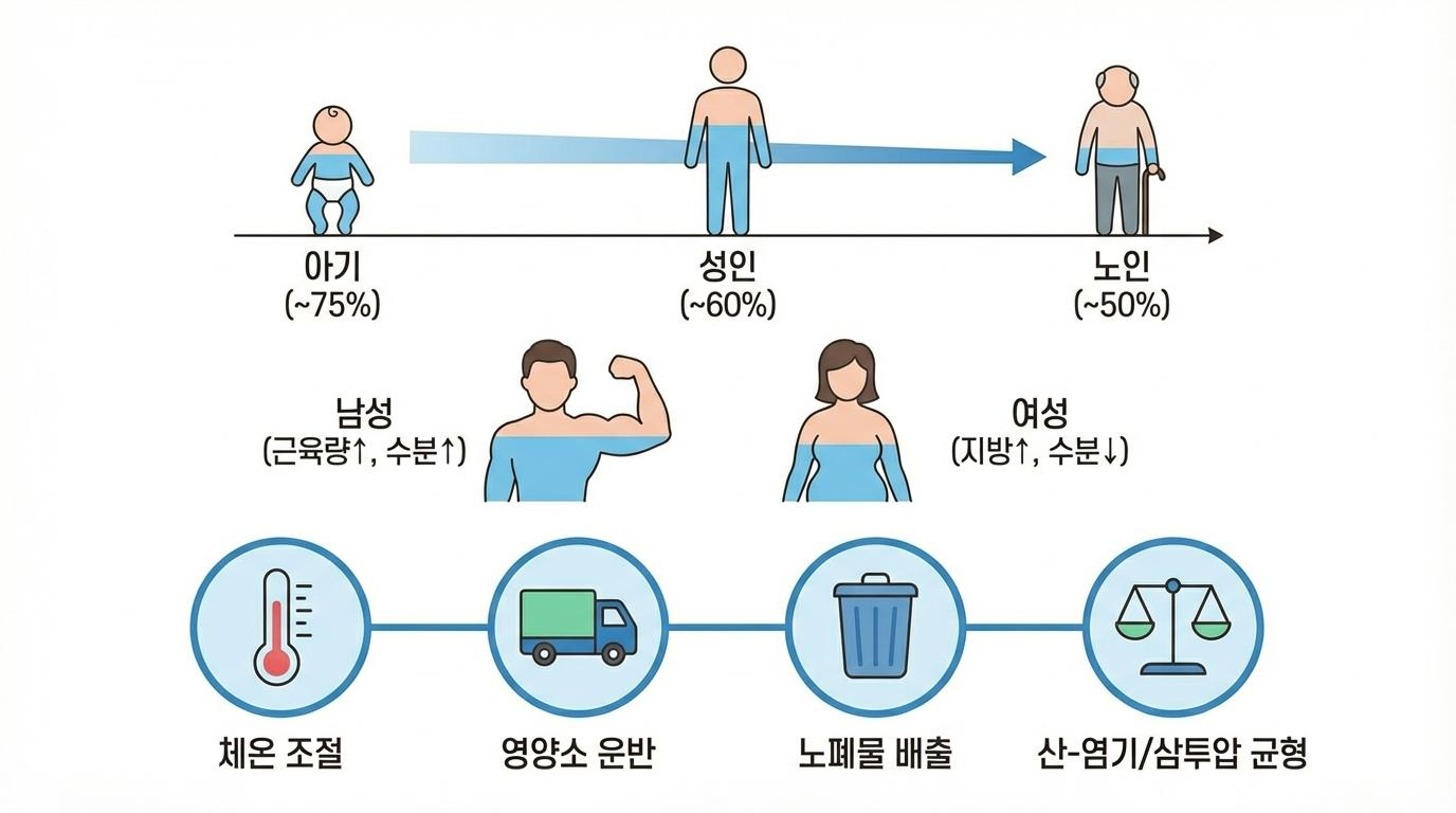 우리 몸의 체액은 모든 사람에게 동일하게 적용되는 정적인 값이 아닙니다. 오히려 개인의 나이, 성별, 체성분에 따라 역동적으로 변화하는 섬세한 구성 요소입니다. 갓 태어난 아기의 체수분 비율은 약 70~75%로 성인보다 훨씬 높지만, 나이가 들수록 점차 감소합니다. 또한 남성과 여성 사이에도 차이가 나타납니다. 일반적으로 근육량이 많고 지방이 적은 남성은 체수분 비율이 높은 반면, 상대적으로 지방 비율이 높은 여성은 체수분 비율이 낮습니다. 특히 비만한 사람의 경우 지방 조직에는 물이 거의 포함되어 있지 않기 때문에, 전체적인 체수분 비율은 더욱 낮아지는 경향을 보입니다. 이러한 변화는 우리 몸이 얼마나 유기적으로 환경과 개인의 특성에 맞춰 조절되는지를 보여주는 예이며, 나이와 체형에 맞는 적절한 수분 관리가 필요함을 시사합니다.