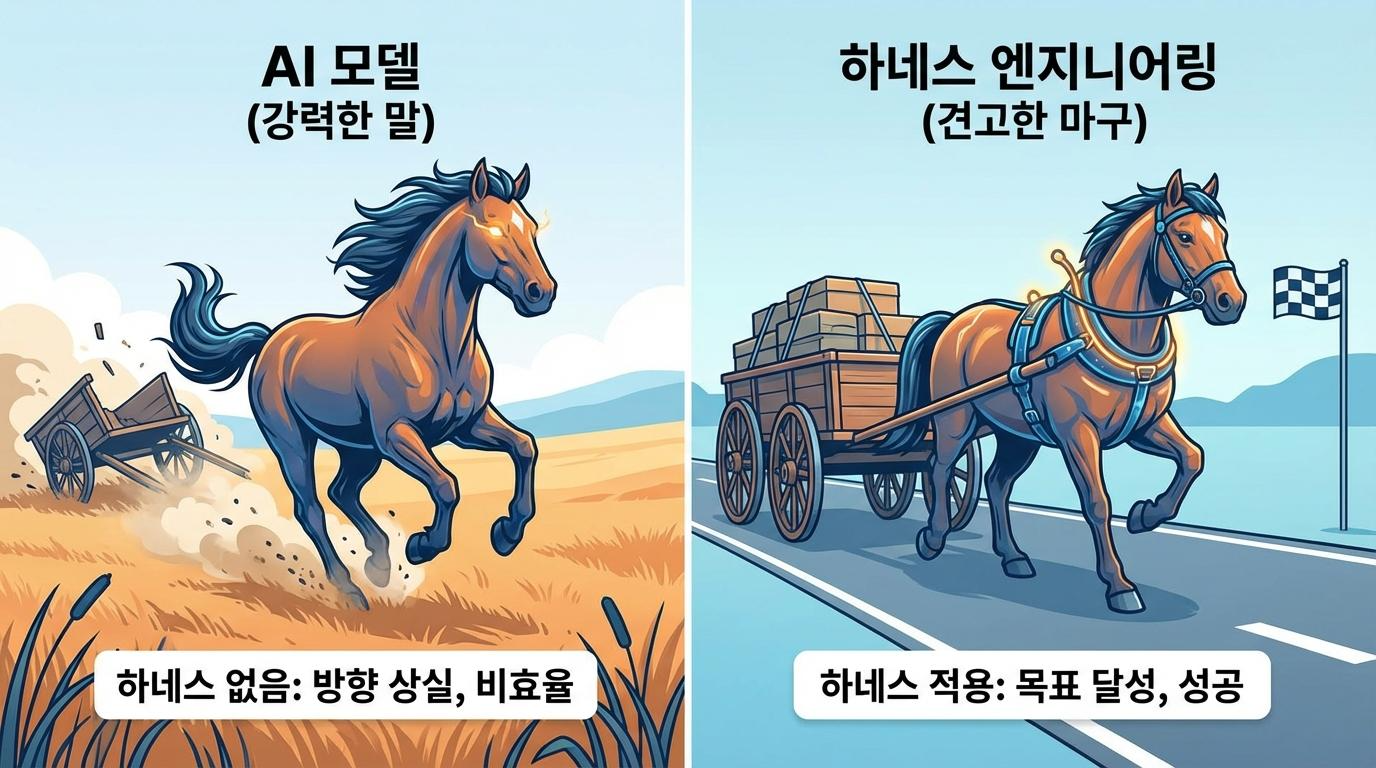 마구(Harness)라는 단어를 들어보셨나요? 아무리 수백 마력의 힘을 가진 명마라 할지라도, 그 힘을 수레나 쟁기에 전달해 줄 마구가 없다면 그저 사방으로 날뛰는 짐승에 불과합니다. 최근 AI 업계에서 불고 있는 변화의 핵심도 이와 같습니다. 엔지니어들이 단 한 줄의 코드도 직접 타이핑하지 않고 100만 줄 규모의 거대한 프로그램을 만들어낸 놀라운 사례가 있었습니다. 그 비결은 더 똑똑한 AI 모델을 쓴 것이 아니었습니다. 바로 AI가 실수하지 않도록 제어하고 이끄는 시스템, 즉 하네스를 설계하는 데 집중했기 때문입니다.