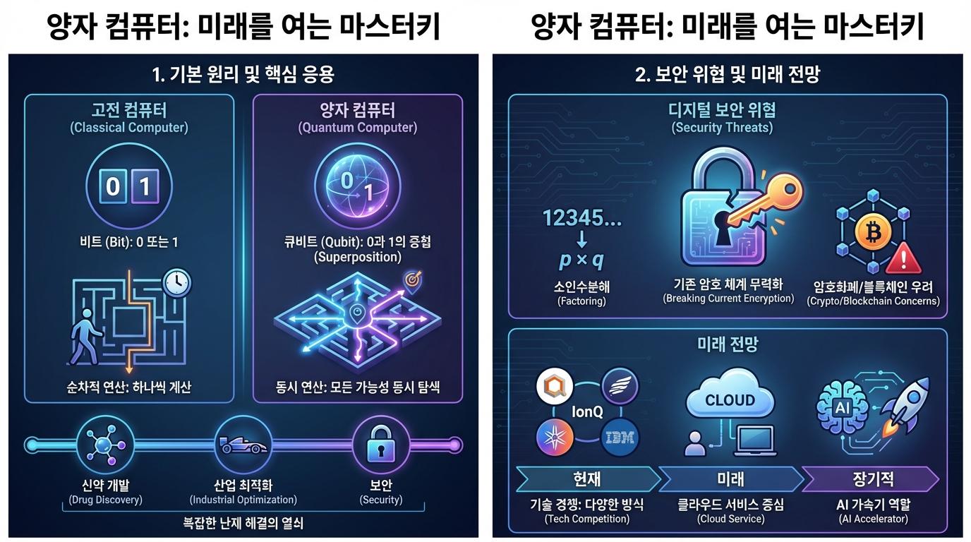 양자 컴퓨터는 단순한 계산기의 발전이 아닙니다. 인류가 그동안 해결하지 못했던 근본적인 문제들을 해결할 ‘마스터키’이자, 기존 디지털 세계의 질서를 재편할 강력한 도구입니다. 비록 지금은 기술 발전의 초기 단계이지만, 이 기술이 가져올 파괴적인 혁신을 미리 공부하고 대비하는 자세가 필요한 시점입니다.