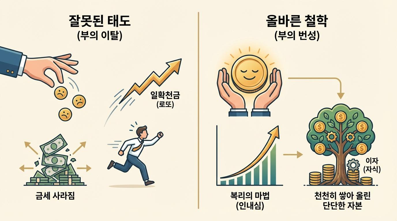 가장 빠르게 부자가 되는 역설적인 방법은 바로 천천히 부자가 되는 것입니다. 일확천금이나 복권과 같은 행운으로 얻은 돈은 그 성질이 날카롭고 조급하여 주인을 해치거나 금세 사라지기 일쑤입니다. 반면, 시간을 들여 단단하게 쌓아 올린 자본은 기초가 튼튼하여 쉽게 무너지지 않습니다. 부를 형성하는 과정에서 핵심은 복리의 원리를 이해하고 기다릴 줄 아는 인내심입니다. 복리는 초반에는 미미해 보이지만 시간이 흐를수록 기하급수적으로 팽창하는 강력한 힘을 지니고 있습니다. 이를 위해서는 미래의 소득을 미리 가져다 쓰는 소비 습관을 버리고, 가용 자산이 스스로 일하게 만드는 구조를 학습해야 합니다.