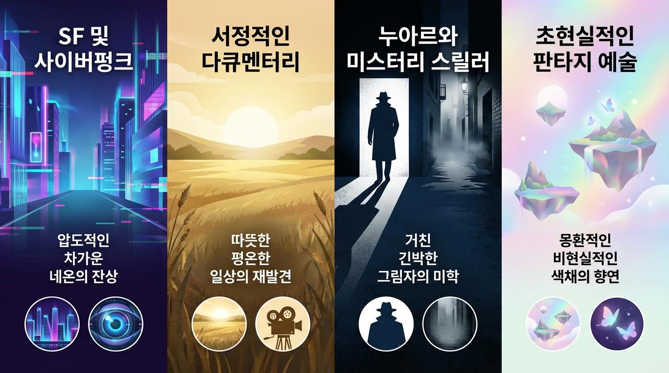 이론적인 이해를 넘어 실제로 AI라는 거대한 캔버스에 첫 붓질을 시작하려는 당신을 위해, 가장 극적인 효과를 낼 수 있는 장르별 핵심 프롬프트 구성안을 준비했습니다. 프롬프트는 단순히 명사의 나열이 아니라, AI에게 세계관을 주입하는 작업입니다. 아래의 템플릿들을 복사하여 당신의 상상력을 덧입혀 보시기 바랍니다. 문장 사이의 쉼표 하나가 영상의 질감을 결정짓는 결정적인 이정표가 될 것입니다.