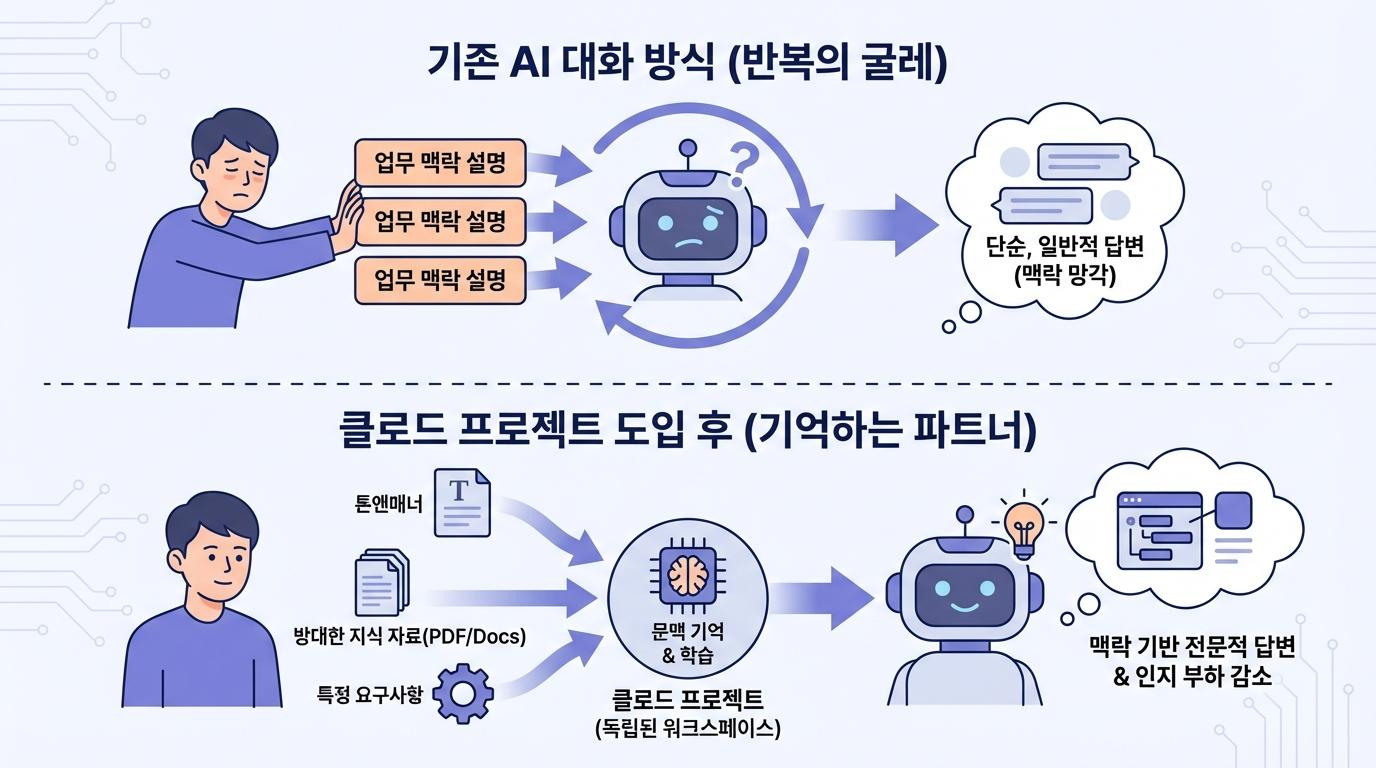 기존의 AI 채팅 도구를 사용해 보신 분이라면 누구나 공감할 장면이 있습니다. 오늘 공들여 설명한 브랜드 톤앤매너를, 내일 또다시 처음부터 설명해야 하는 상황입니다. 클로드 프로젝트는 이 반복을 구조적으로 제거합니다.