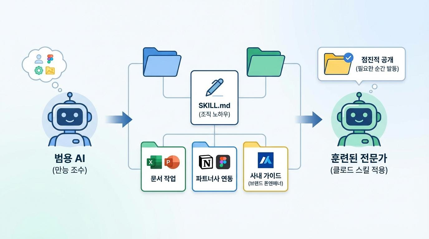 아무리 뛰어난 인재도 첫날 출근하면 조직의 맥락을 모릅니다. 회사만의 문서 양식, 브랜드 톤앤매너, 반복되는 업무 절차들. 이것들을 체득하기까지는 시간이 걸립니다. 그런데 만약 그 모든 노하우를 담은 온보딩 가이드를 건네주면 어떨까요? Anthropic이 2025년 10월 선보인 '클로드 스킬(Claude Skills)'은 정확히 그 발상에서 출발합니다. 범용 AI에게 조직의 전문성을 패키지로 장착시키는 것. 스킬은 클로드를 '만능 조수'에서 '훈련된 전문가'로 전환시키는 새로운 언어입니다.