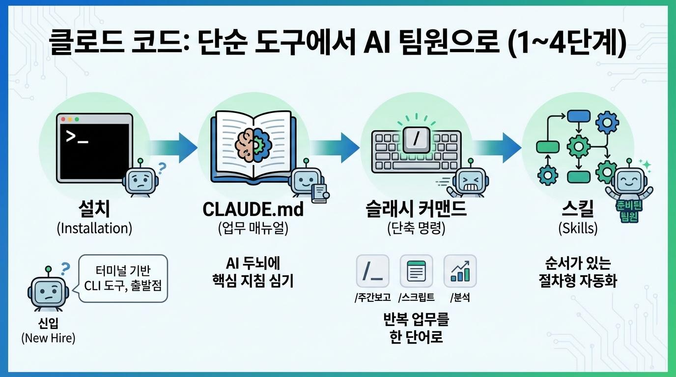 클로드 코드를 설치한 순간, 많은 분들이 비슷한 실수를 합니다. 텅 빈 터미널 앞에서 뭔가를 입력하고, 그럭저럭 괜찮은 결과를 받고, "오, 꽤 쓸 만하네"라며 그 수준에서 멈추는 것입니다. 하지만 클로드 코드는 그냥 쓰는 것과 제대로 세팅해서 쓰는 것 사이의 간극이 유독 큰 도구입니다. 마치 뛰어난 신입 직원을 채용해 놓고 아무런 업무 인수인계도 없이 바로 일을 던지는 것과 같습니다. 결과물이 나오긴 하지만, 그 직원의 진짜 잠재력과는 거리가 먼 이야기입니다. 지금부터 소개할 일곱 단계는 클로드 코드라는 AI 직원을 진짜 우리 팀의 일원으로 만드는 온보딩 프로세스입니다.