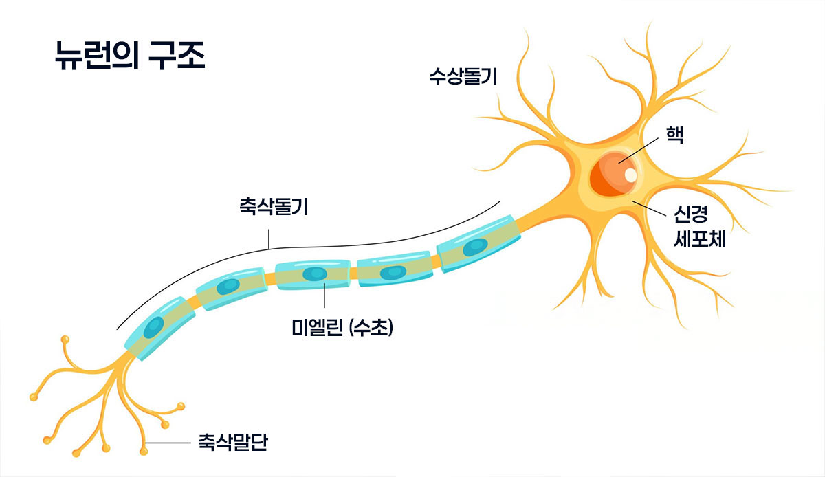 수상돌기(Dendrite): 다른 뉴런에서 오는 신호를 받아들이는 안테나 역할을 합니다.