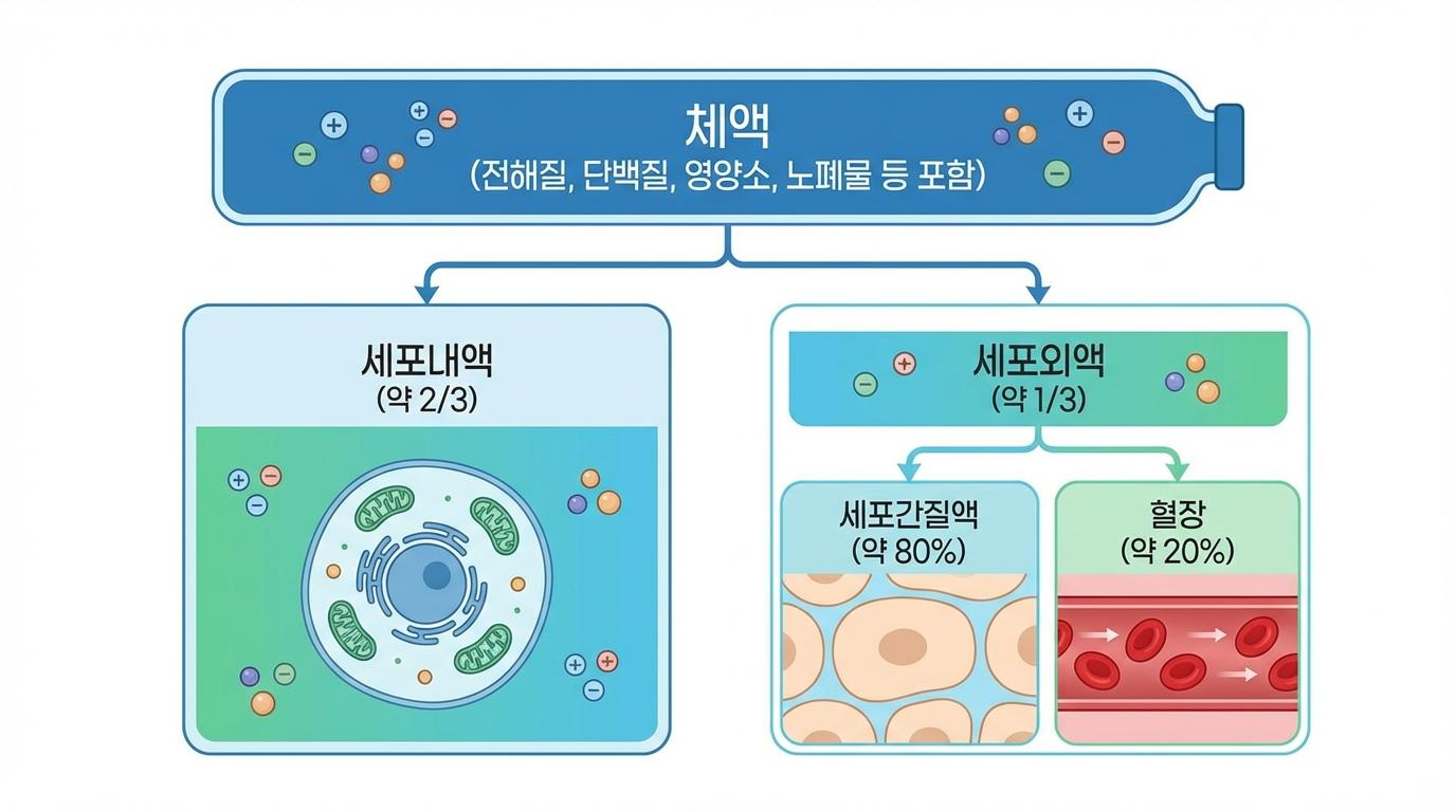 우리 몸의 체액은 마치 정교하게 설계된 건축물처럼, 두 개의 큰 구획으로 나뉘어 존재합니다. 첫 번째는 우리 몸을 구성하는 각 세포의 내부에 채워져 있는 ‘세포내액’입니다. 성인 기준으로 전체 체액의 약 2/3를 차지하는 이 세포내액은 세포가 물질 대사를 하고 에너지를 생성하며, 다양한 화학 반응을 일으키는 생명의 무대입니다. 나머지 1/3은 세포 밖에 존재하는 ‘세포외액’으로, 이는 다시 두 가지로 세분화됩니다. 세포외액의 약 80%는 세포와 세포 사이를 채우고 있는 ‘세포간질액’이며, 나머지 20%는 혈액의 액체 성분인 ‘혈장’입니다. 이처럼 치밀하게 분할된 체액 시스템은 우리 몸이 외부 환경 변화 속에서도 항상성을 유지하고 생명을 이어갈 수 있게 하는 근본적인 토대가 됩니다.