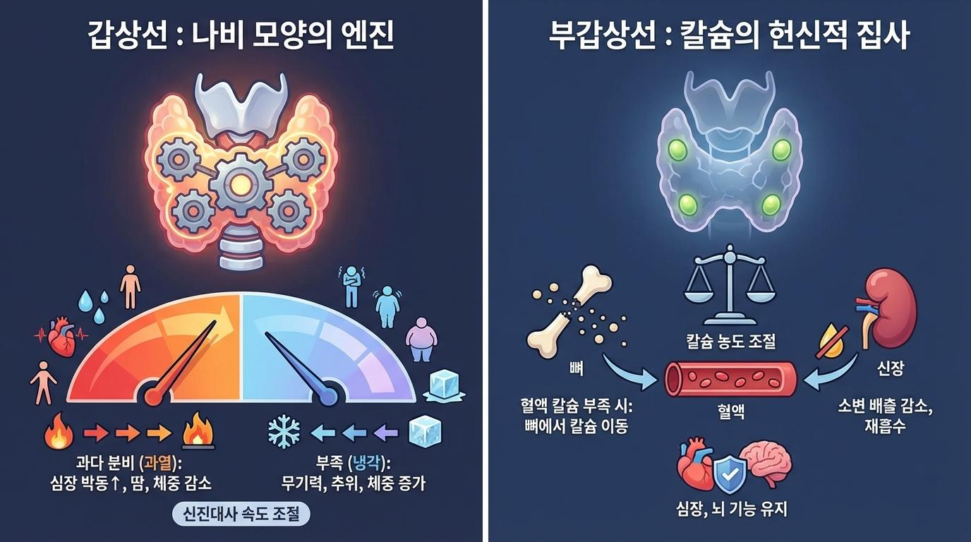 우리 목의 한가운데, 아주 작은 크기로 자리 잡고 있지만 온몸의 에너지를 관장하고 뼈의 강도까지 조절하는 숨은 거인들이 있습니다. 바로 갑상선과 부갑상선입니다. 이름이 비슷해 마치 형제처럼 느껴지지만, 사실 이 둘은 사는 곳만 이웃일 뿐 하는 일은 전혀 다른 '남남'이자 각자의 영역에서 생명을 지키는 독립적인 전문가들입니다. 오늘은 작지만 우리 몸의 거대한 균형을 이끄는 이 두 기관의 흥미로운 이야기를 들려드리려 합니다.