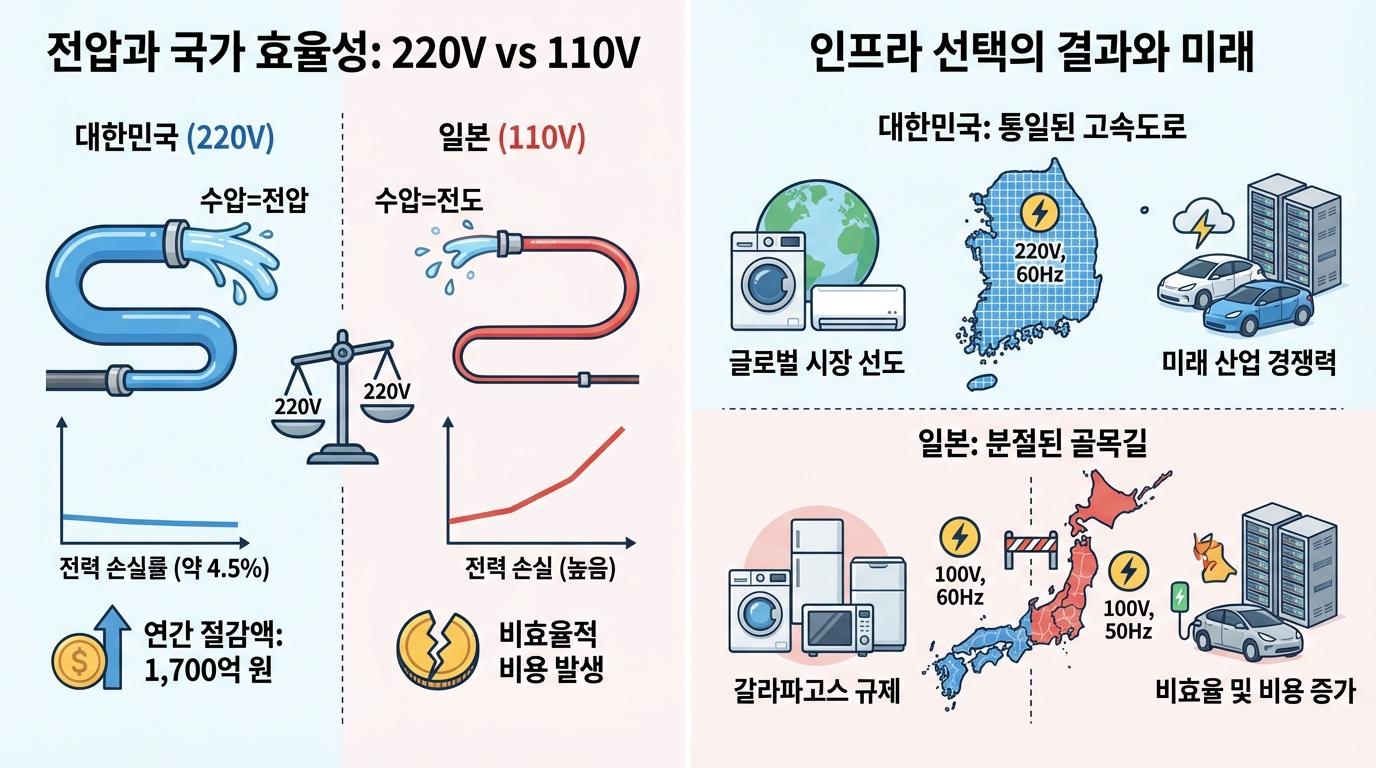 당시 일본은 '저전압이 구리가 덜 든다'는 잘못된 상식을 믿었습니다. 그러나 실상은 정반대였습니다. 낮은 전압으로 많은 전류를 흘려보내려니 더 굵은 전선이 필요했고, 송전 과정에서 공중으로 사라지는 전기, 즉 막대한 국가적 손실이 기하급수적으로 늘어난 것입니다. 현재 한국은 세계 최고 수준인 4.5%대의 송배전 손실률을 자랑합니다. 반면 일본은 콘센트에 플러그를 꽂는 순간부터 보이지 않는 '비효율 세금'을 내고 있는 셈입니다. 이러한 물리적 차이가 장기적으로 국가 경제에 얼마나 큰 영향을 미 미치는지 보여주는 명확한 사례입니다.