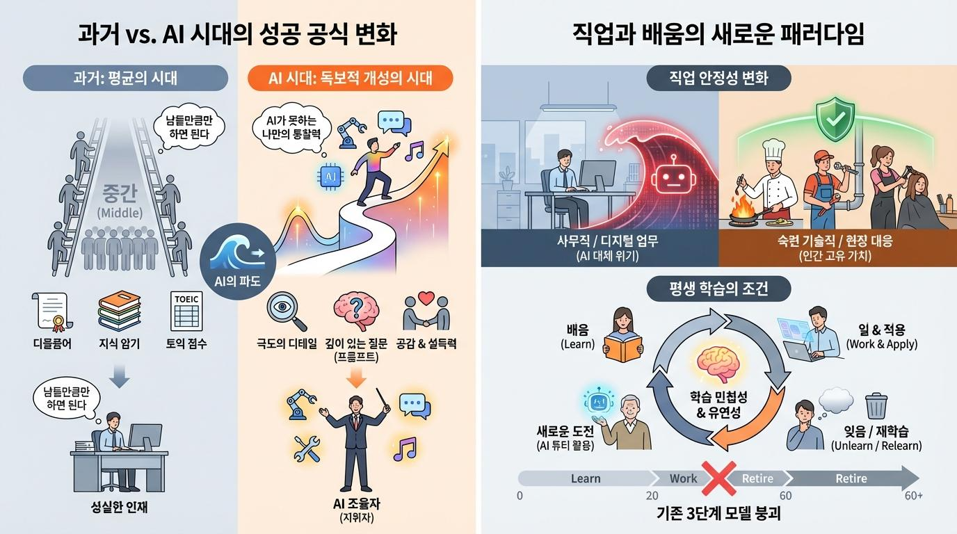 오늘은 인공지능(AI)의 급격한 발전이 우리가 오랫동안 믿어온 '성공의 공식'을 어떻게 뒤흔들고 있는지, 그리고 그 안에서 우리는 어떤 새로운 생존 전략을 짜야 하는지 깊이 있게 들여다보고자 합니다.