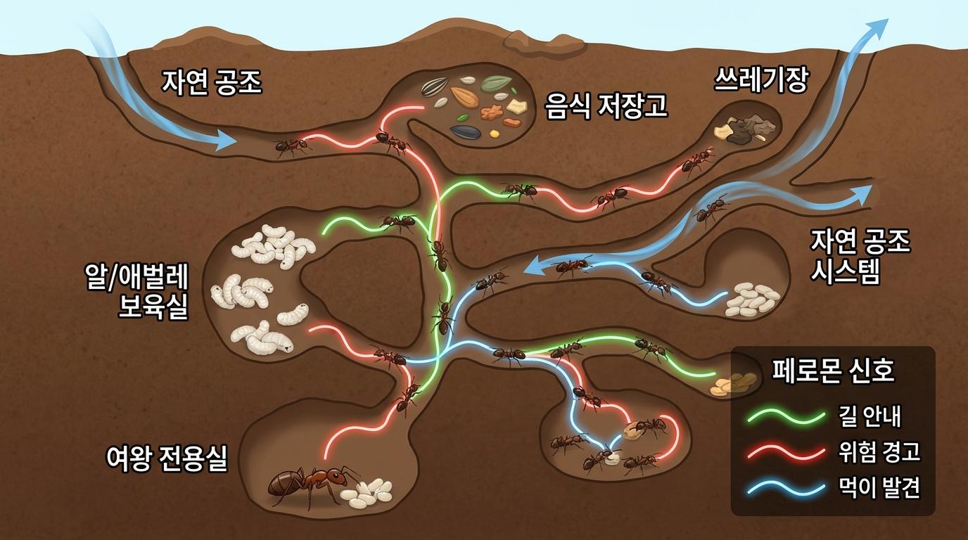 개미굴을 단순한 흙구멍이라고 생각하셨다면 큰 오산입니다. 개미 집은 자연이 만든 최고의 건축물 그 자체이자, 정교한 생명 유지 시스템입니다. 깊이는 2m에서 4m, 많게는 10층 이상 되는 복층 구조로 이루어져 있으며, 알을 보관하는 방, 애벌레 보육실, 여왕 전용실, 음식 저장고, 쓰레기장까지 '용도별 구역'이 완벽하게 나뉘어 있습니다.