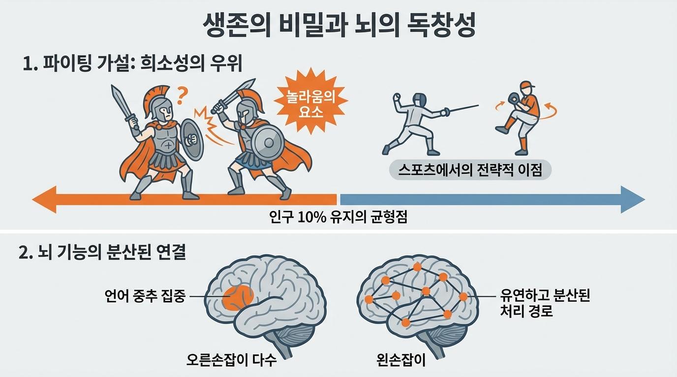 원시 시대, 생사가 오가는 육탄전 상황을 상상해 보십시오. 오른손잡이들은 오른손잡이 적과의 싸움에 익숙합니다. 그런데 갑자기 왼손잡이 적이 나타나 예상치 못한 각도에서 주먹을 날린다면 어떨까요? 이 '놀라움의 요소'는 0.1초가 급박한 전투에서 왼손잡이에게 치명적인 우위를 제공했습니다.