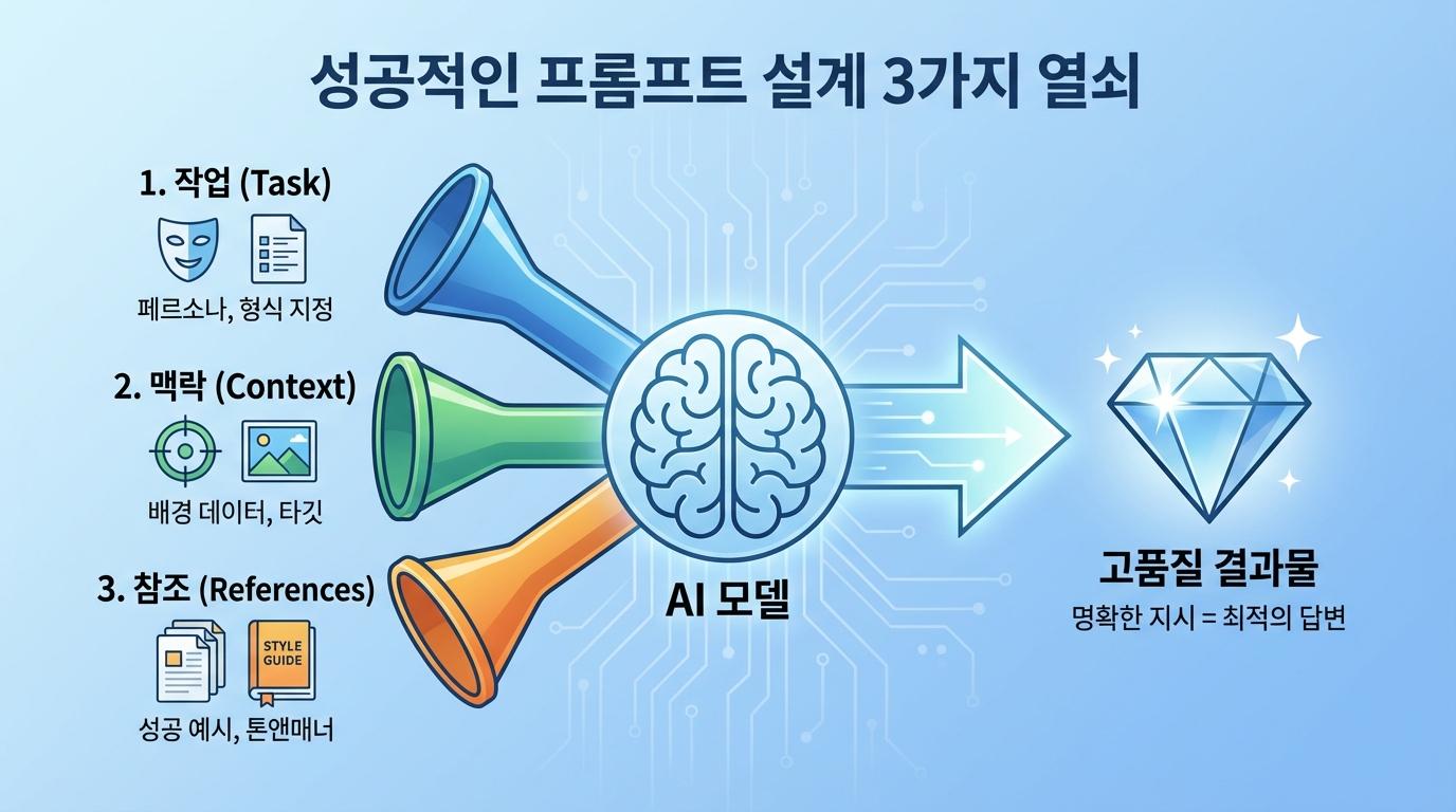인공지능으로부터 원하는 답을 얻지 못하는 가장 흔한 이유는 질문이 모호하기 때문입니다. AI에게는 인간의 직관이나 암묵적인 이해가 부족하므로, 우리가 원하는 바를 구체적으로 명시해야 합니다. 이를 위해 세 가지 필수 요소, 즉 작업(Task), 맥락(Context), 참조(References)를 활용해야 합니다.